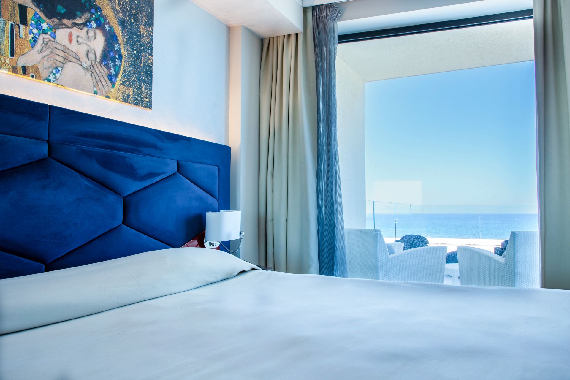 Suite vista mareLa Suite si articola in zona ingresso, soggiorno e camera con disimpegno interno. Le ampie vetrate di fronte al mare le arricchiscono di luce. L’arredo armoni…